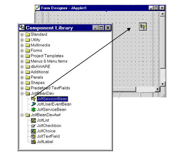The following figure Visual Café 3.0 Form Designer illustrates how JoltBeans appear when they are placed on the palette of the Form Designer.