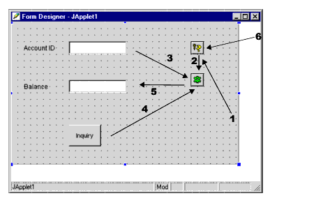 The steps below correspond to the callouts shown in the figure Sequence in Which JoltBeans Are Wired. Each of the steps below is detailed in the sections that follow. Step 2: Wire JoltSessionBean to JoltServiceBean Using PropertyChange Step 3: Wire the accountID JoltTextField as Input to the JoltServiceBean Using JoltInputEvent Step 5: Wire JoltServiceBean to the Balance JoltTextField Using JoltOutputEvent Step 7: Compile the Applet (not shown as a callout) Step 1: Wire the JoltSessionBean Logon