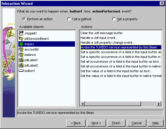 The Interaction Wizard window is displayed, as shown in the figure Select inquiry Object and Invoke the TUXEDO Service... Action, with the prompt: What do you want to happen when button1 fires actionPerformed event? Select inquiry Object and Invoke the TUXEDO Service... Action