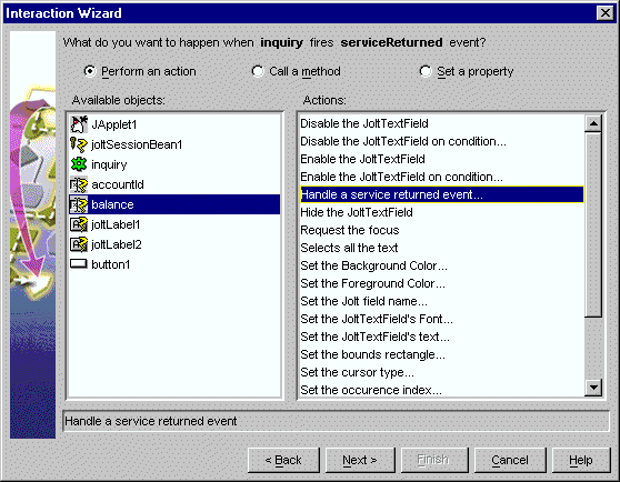 The Interaction Wizard window is displayed, as shown in the figure Select balance Object and Handle a service returned event Action, with the prompt: What do you want to happen when inquiry fires serviceReturned event? Select balance Object and Handle a service returned event Action