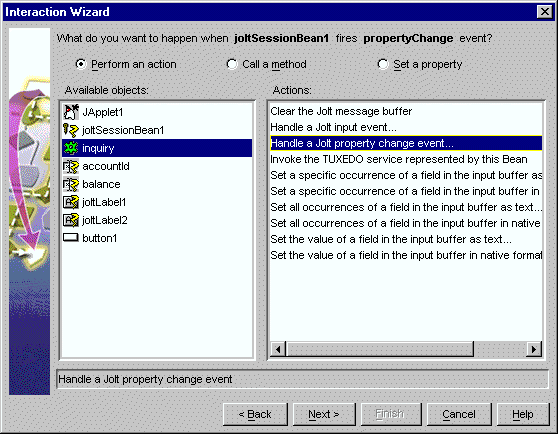 The Interaction Wizard window is displayed as shown in the figure Select inquiry Object and Handle a Jolt input event Action, with the prompt: What do you want to happen when accountId fires dataChanged event? Select inquiry Object and Handle a Jolt input event Action