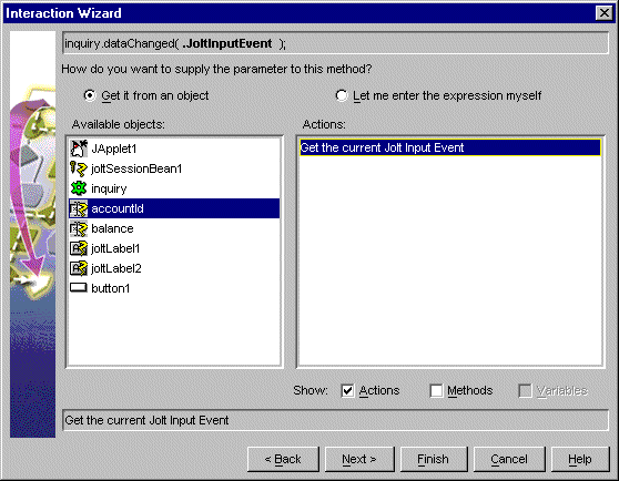 The Interaction Wizard window is displayed, as shown in the figure Select inquiry Object and Get the JoltOutputEvent object Action, with the prompt: How do you want to supply the parameter to this method? Select inquiry Object and Get the JoltOutputEvent object Action