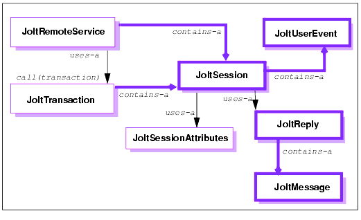 The following figure illustrates the relationship between the instantiated objects of the Jolt Class Library classes.