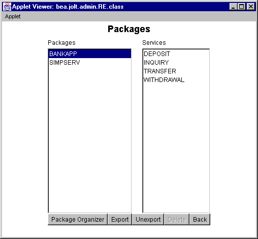 To make a service available to a Jolt client, you export it. All services in a package must be exported or unexported as a group. A service is made available by using the Export and Unexport radio buttons.