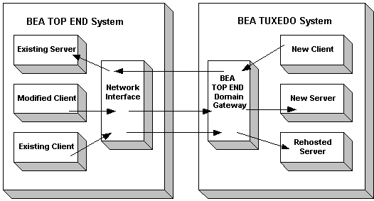 As shown in the following figure, the TOP END Domain Gateway supports three scenarios for interoperability between the BEA TOP END and BEA Tuxedo systems: