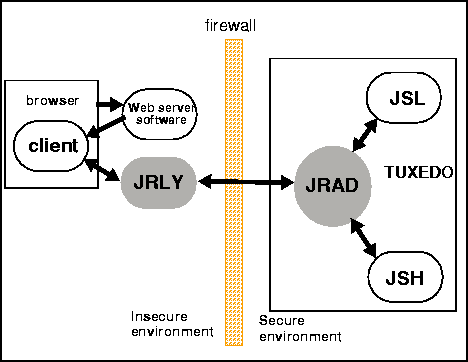 The Jolt Internet Relay is a component that routes messages from a Jolt client to a JSL or JSH. This eliminates the need for the JSH and TUXEDO to run on the same machine as the Web server (generally considered as insecure). The Jolt Relay (JRLY) is not a TUXEDO server or a TUXEDO client. It is a stand-alone program that routes the Jolt messages from the Internet to the JSL or JSH