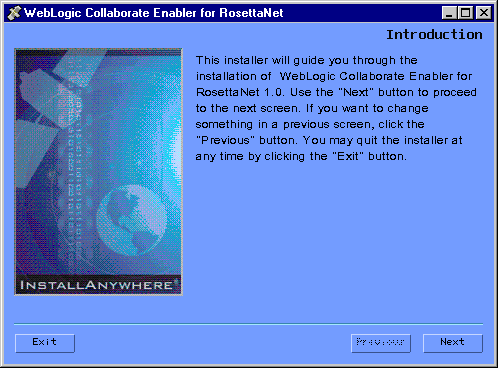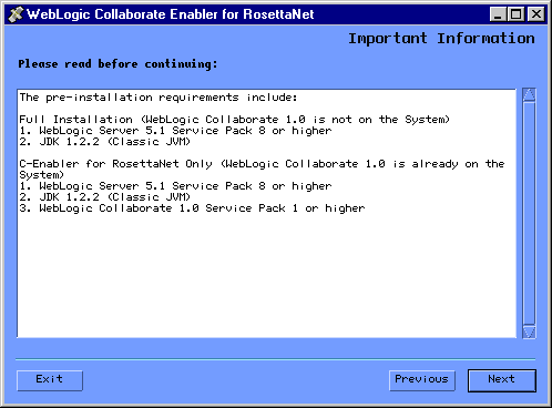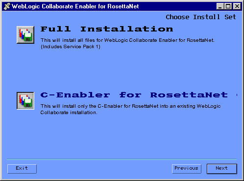 You can install WebLogic Collaborate Enabler for RosettaNet as either a Full Installation (if you do not have WebLogic Collaborate 1.0 installed on your system), or a C-Enabler for RosettaNet Only Installation (if you already have WebLogic Collaborate 1.0 installed on your system).