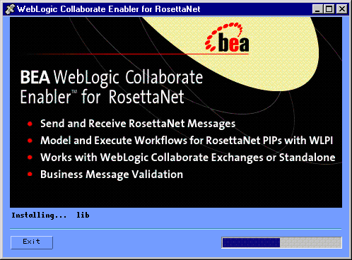 Console-mode installation provides a method to install WebLogic Collaborate Enabler for RosettaNet using a text-based installation program that offers the same capabilities as the graphics-based installation program. You can install WebLogic Collaborate Enabler for RosettaNet on Solaris, HP-UX, and AIX operating systems using the console mode.