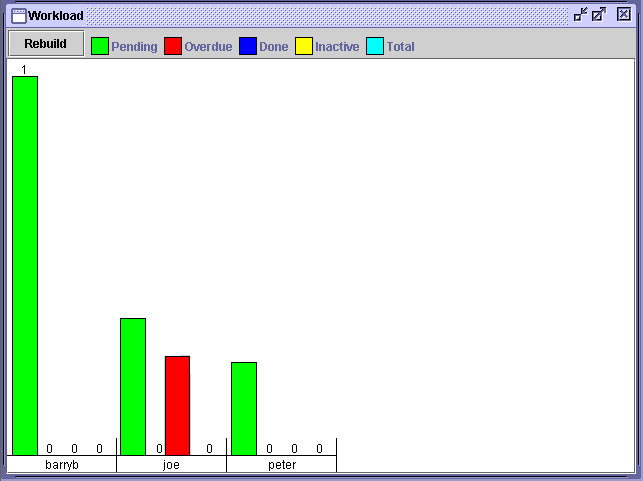 The contents of the report are broken down by user, role, or totals, depending on the options selected. This display may scroll left and right if there is a lot of information. A bar chart indicates the total number of tasks of various state counted. The legend at the top of the window shows what each color represents, depending on the options selected at design time. For more precise indicators, the actual number of tasks is shown above each bar.