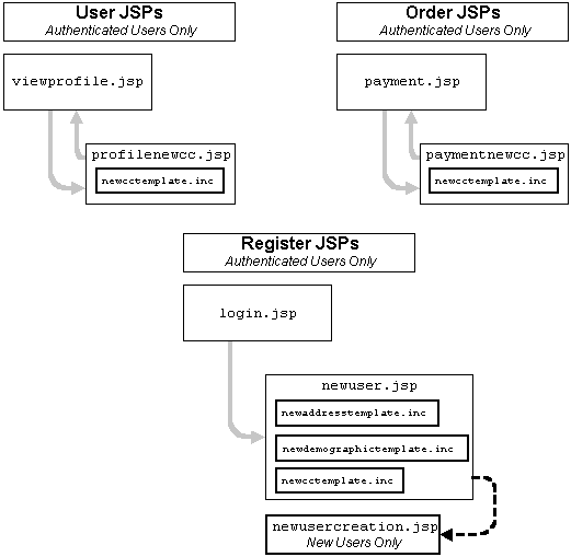 Many of the JSP templates include other JSP templates. The logic behind using includes is to reduce repetition and provide consistency across the various templates that need access to the same information. The diagram shows several JSPs that use includes. Notice how the viewprofile.jsp and the payment.jsp use the same include.