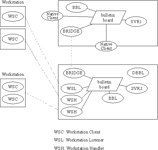 Workstation extends the availability of a native BEA TUXEDO application, like the one shown above, to clients resident on workstations. With the Workstation feature, workstations are not required to be within the administrative domain of the application. The Workstation instead, defines an environment where clients can access services of an application through a surrogate handler process. A BEA TUXEDO application using Workstation might be diagrammed as shown in Figure 1-2.