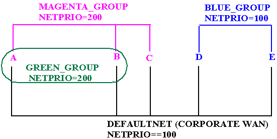's network priority is commented out, the priority defaults to 100. Network group number entries are unique. Some of the network priority values are equal, as in the case of MAGENTA_GROUP