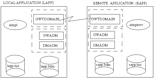 On AIX, Build a local application configuration file using The local domain gateway configuration file ( Build a remote application configuration file and a remote domain gateway configuration file. The remote application configuration file ( The remote domain gateway configuration file ( Once you create both the local and remote domains, you can then boot the application using Once both applications are booted, a client in the local application can call the The Domains example illustrated in Figure and throughout this chapter consists of two applications, both of which are based on the