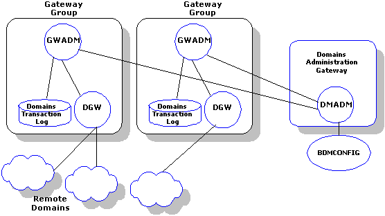 ) that enables run-time administration of the Domains gateway group, and a Domains administrative server (DMADM