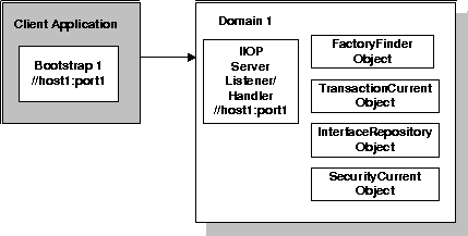 A domain is a way of grouping objects and services together as a management entity. A WLE domain has at least one IIOP Server Listener/Handler (ISL/ISH) and is identified by a name. One client application can connect to multiple WLE domains using different Bootstrap objects. For each WLE domain, a client application can get a FactoryFinder object, an InterfaceRepository object, a SecurityCurrent object, and a TransactionCurrent object, which correspond to the services offered within the WLE domain. For a description of the Bootstrap object, the FactoryFinder object, the InterfaceRepository object, the SecurityCurrent object, and the TransactionCurrent object, see "Environmental Objects" in this chapter.