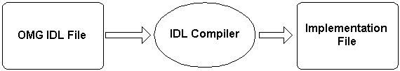 As stated earlier, the code that implements the operations defined for a CORBA object's interface is called an object implementation. For C++, this code consists of a set of methods, one for each of the operations defined for the interfaces in your application's OMG IDL file. The file containing the set of object implementations for your application is known as an implementation file. The WebLogic Enterprise system provides an IDL compiler, which compiles your application's OMG IDL file to produce several files, one being an implementation file, shown in the following figure.