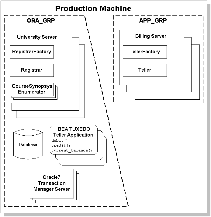 To make the Production sample application easy for you to use, this application is configured on the WebLogic Enterprise software kit to run on one machine, using one database. The examples shown in this chapter, however, show running this application on two machines using two databases.
