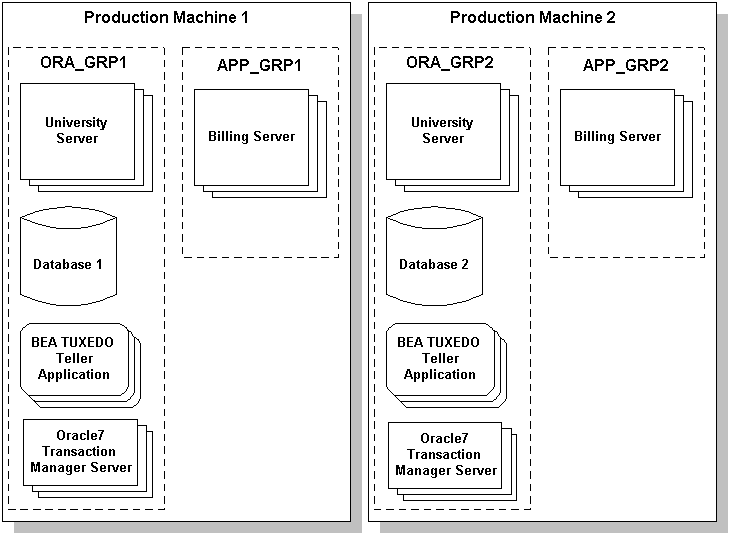 In Figure 7-2, the only difference between the content of the groups on Production Machines 1 and 2 is the database. The database for Production Machine 1 contains student and account information for a subset of students. The database for Production Machine 2 contains student and account information for a different subset of students. (The course information table in both databases is identical.) Note that the student information in a given database may be completely unrelated to the account information in the same database.