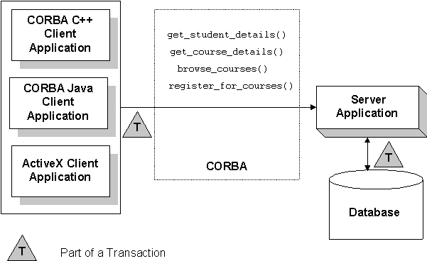 In the Transactions sample application, the operation of registering for courses is executed within the scope of a transaction. The transaction model used in the Transactions sample application is a combination of the conversational model and the model in which a single client invocation makes multiple individual operations on a database.