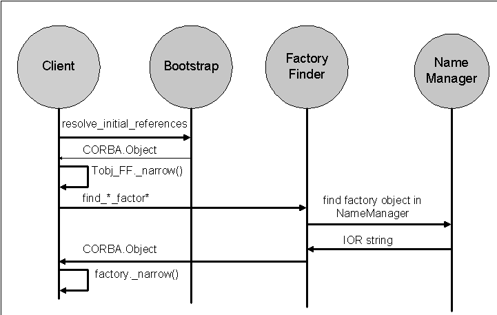 During server application initialization, application factories need to be registered with the NameManager. Clients can then be provided with the object reference of a FactoryFinder to allow them to retrieve a factory object reference based on associated names that were created when the factory was registered.