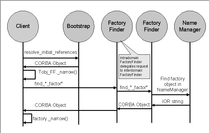 A client application must obtain a reference to a FactoryFinder before it can begin locating an appropriate factory. To obtain a reference to a FactoryFinder in the domain to which a client application is associated, the client application must invoke the