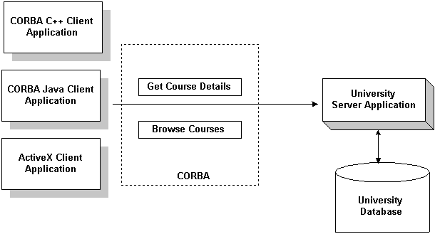 Note: The CORBA client applications in the University sample applications use static invocation. For an example of using the dynamic invocation interface, see Creating Client Applications. When creating CORBA Java client applications, see your Java ORB's documentation for information about compiling the OMG IDL to get client stubs. ActiveX client applications do not use client stubs.