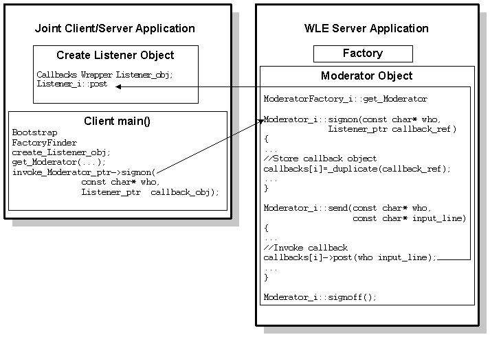 For example, in the Chat Room sample application, the joint client/server application uses the skeleton and client stub for the Listener object (that is, the callback object) to implement the object. The joint client/server application also uses the client stubs for for the Moderator and ModeratorFactory to invoke operations on the objects. The WLE server application uses the skeletons for the Moderator and ModeratorFactory objects to implement the objects and the client stub for the Listener object to invoke operations on the object.