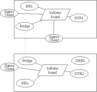 Client processes (shown as Native Clients in Figure 1-1) are invoked by users logged in directly on a node where a bulletin board for their application exists under the control of a BBL. They are considered to be within the administrative domain of the application.