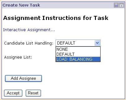 From the Candidate List Handling drop-down list, she selects the Load Balancing option, and clicks Accept. As a result the Loan Officer with the least amount of assigned tasks will be assigned the Loan Request.