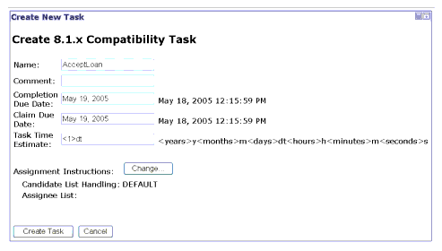 For Assignment Instructions, she has decided to assign the Loan Request task type to a Loan Officer based on Load Balancing. To do so, she clicks the Change button and the following appears: