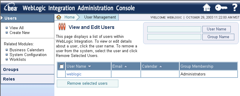 In this step, you set up the actors in the tutorial, that is, the users and groups required to complete the tasks you design in the tutorial business process. Specifically, if you have not already done so, you create an integration domain for your Worklist application. Next, you use the WebLogic Integration Administration Console to configure users and groups. Lastly, you create a business calendar for Acme Financial Group.