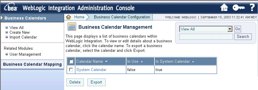 Navigate to the Business Calendar Configuration module in the WebLogic Integration Administration Console.