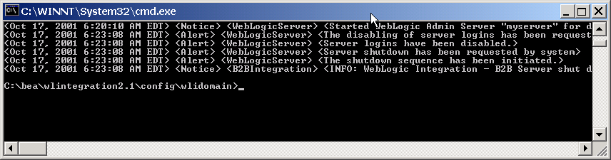 Once WebLogic Server and all applications are terminated, you can restart WebLogic Integration, as described in Starting WebLogic Integration on Windows. Stopping WebLogic Integration from the Command Line To stop WebLogic Integration from the command line: