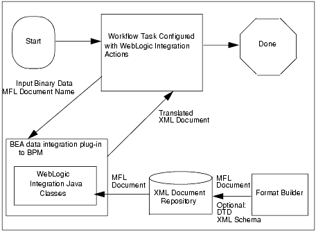 In addition to this data translation capability, the data integration plug-in provides event data processing in binary format, in-memory caching of MFL documents and translation object pooling to boost performance, a BinaryData variable type to edit and display binary data, exporting of entirely self-contained workflow definition packages, and execution within a WebLogic Server clustered environment.