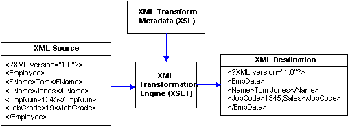 Figure 1-6 demonstrates one XML grammar converted to another using an XSLT engine. The transformation metadata in this case is an XSL style sheet that describes how one XML grammar is mapped into another.