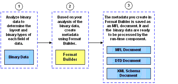 To perform a translation, you create a description of your binary data using the design-time component (Format Builder). This involves analyzing binary data so that its record layout is accurately reflected in the metadata you create in Format Builder. You then create a description of the input data in Format Builder and save this metadata as a Message Format Language (MFL) document. Data integration includes importers that automatically create message format definitions.