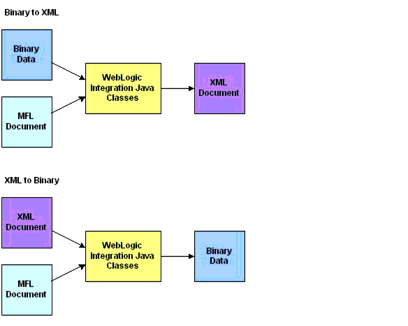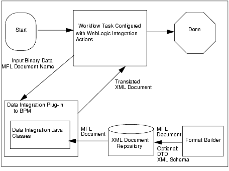 Binary to XML Translation Listing 1-1 is a code sample that shows the parsing of a file containing binary data into an XML document object. The MFL file mymfl.mfl is used as the description of the binary data contained in the file mybinaryfile. Listing 1-1 Sample Code for Binary to XML Translation XML to Binary Translation Listing 1-2 is a code sample that shows the translation of the XML data contained in the file myxml.xml to the binary format specified by the MFL document mymfl.mfl. The binary data is written to the file mybinaryfile. Listing 1-2 Sample Code for XML to Binary Translation The Plug-In to Business Process Management Business process management (BPM) in WebLogic Integration automates workflow, business-to-business processes, and enterprise application assembly. It runs on the WebLogic Server and is a robust J2EE standards-based workflow and process integration solution. Using an intuitive flowchart paradigm, business analysts use the process engine to define business processes that span applications or to automate human interaction with applications. Developers can use the process engine to assemble application components quickly without programming, execute them, and manage them. The process engine has an extensible architecture that allows new functionality to be plugged in. WebLogic Integration includes a data integration plug-in that provides XML to binary and binary to XML translation that is accessible through a BPM action. The Data Integration Plug-In for business process management (BPM) provides for an exchange of information between applications by supporting data translations between binary formats from legacy systems and XML. The Data Integration Plug-In provides BPM actions that allow you to access XML to Binary and Binary to XML translations. In addition to this data translation capability, the Data Integration Plug-In provides event data processing in binary format, in-memory caching of MFL documents and translation object pooling to boost performance, a BinaryData variable type to edit and display binary data, exporting of entirely self-contained workflow definition packages, and execution within the WebLogic Server clustered environment. The following illustration describes the relationship between data translation and BPM. Figure 1-5 Data Integration and BPM Relationship