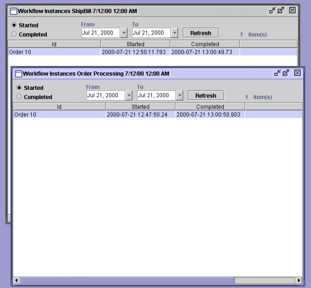 The Order Processing and ShipBill workflow instances are marked as complete as reflected in the monitoring dialog boxes. The completed date and time are displayed. Figure 5-15 Workflow Instances Dialog Boxes: Completed Date and Time