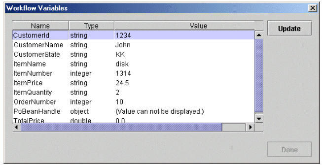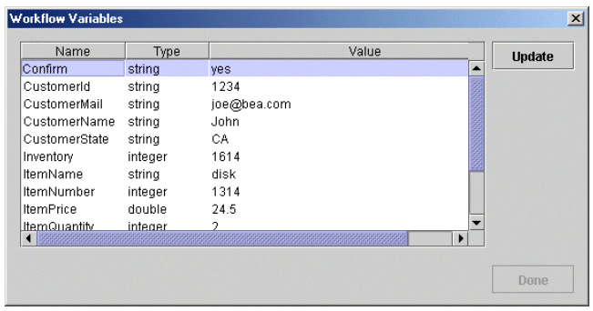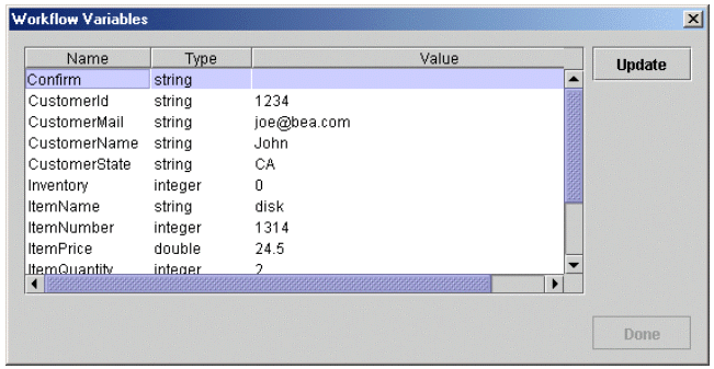 The dialog box shows that both Confirm and Inventory now have values. Figure 5-9 Workflow Variables Dialog Box