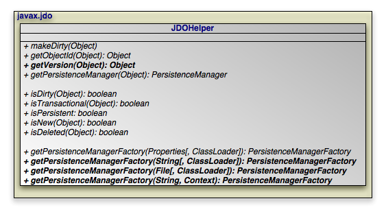public static void makeDirty (Object pc, String fieldName); public static Object getObjectId (Object pc); public static Object getVersion (Object pc); public static PersistenceManager getPersistenceManager (Object pc);