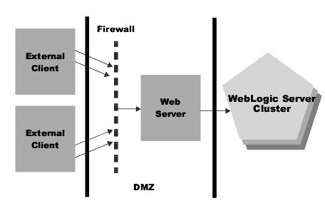 With this configuration, the web server is a gateway, operating in the "demilitarized zone" (DMZ). Clients interact exclusively with the web server. WebLogic Server connections come only from proxied web server requests, enhancing the security of your WebLogic Server applications and back-end resources.