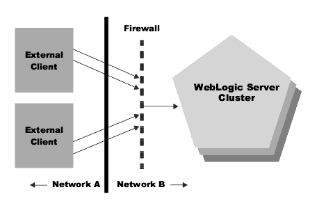 There are many ways to combine firewalls, WebLogic Server, and other network servers. Figure 6-1 illustrates a typical setup with a firewall that filters traffic destined for a WebLogic Server cluster.
