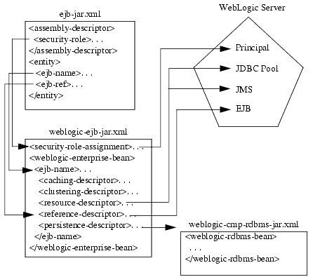 weblogic-ejb-jar.xml contains properties that define the caching, clustering, and performance behavior of EJBs. It also contains properties that map available WebLogic Server resources to EJBs. WebLogic Server resources include security role names, data sources such as JDBC pools and JMS connection factories, other deployed EJBs, and container-managed persistence services available in the server.