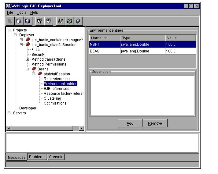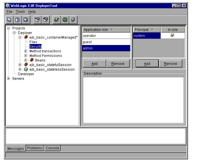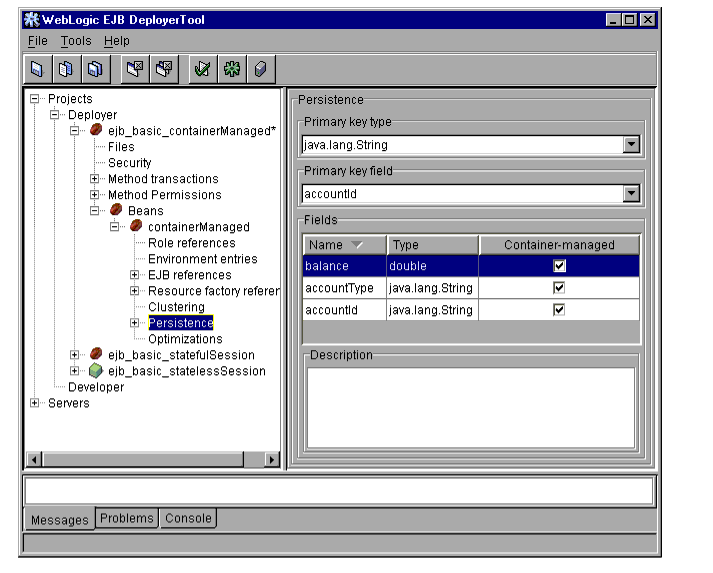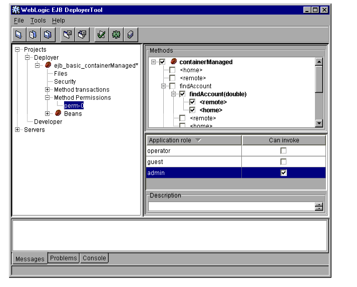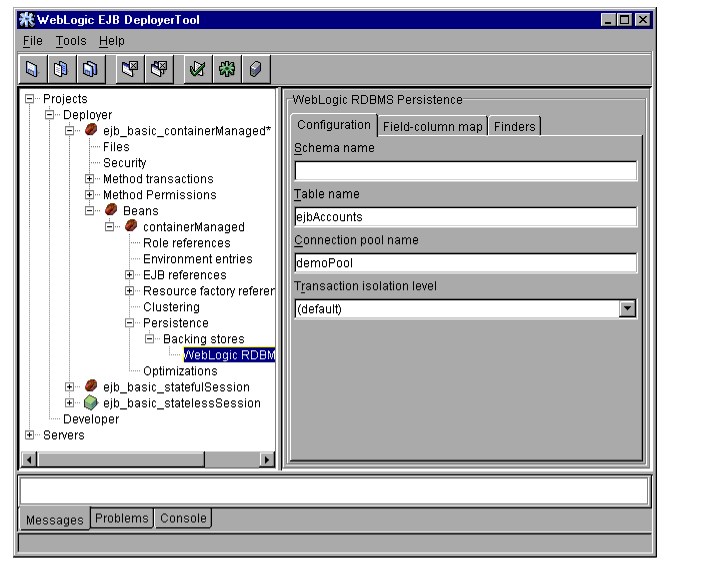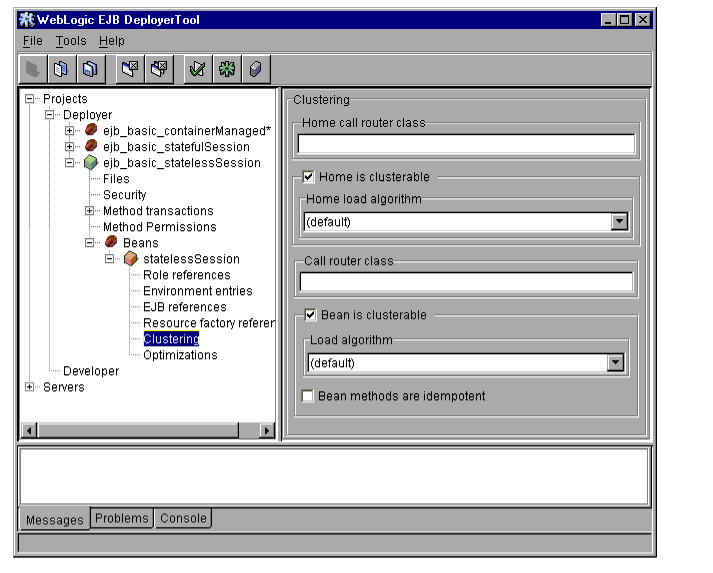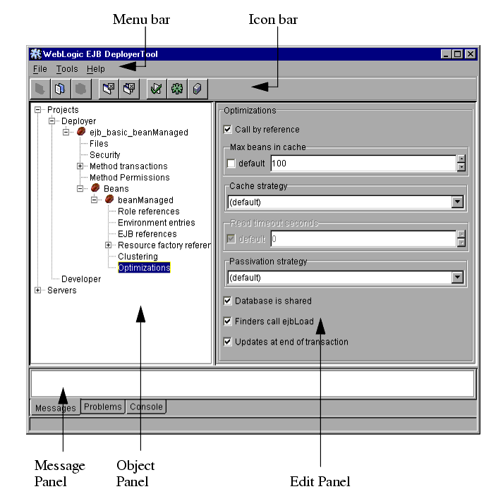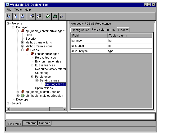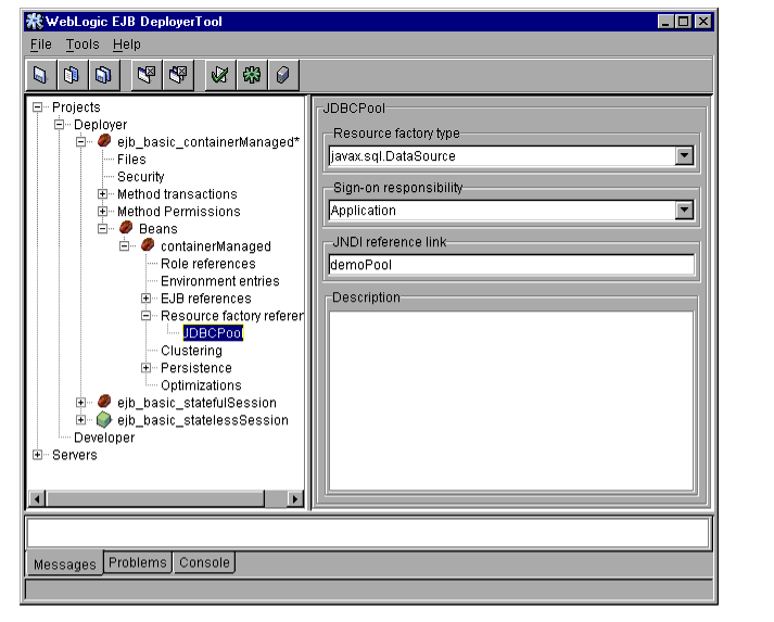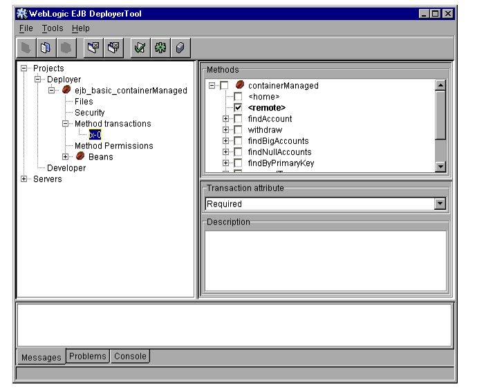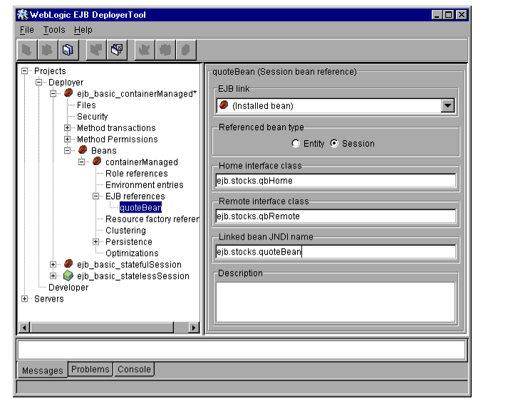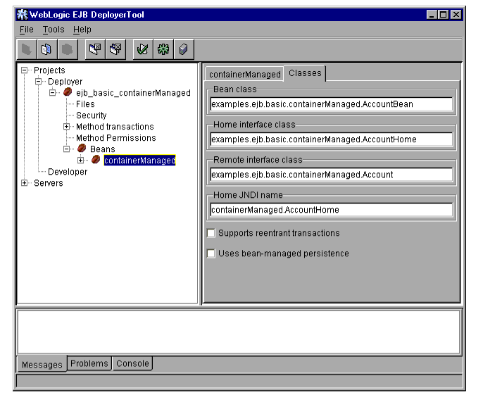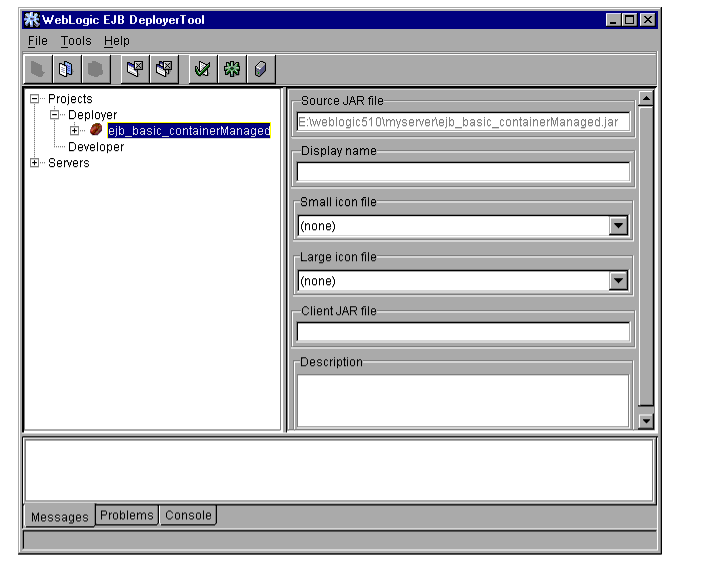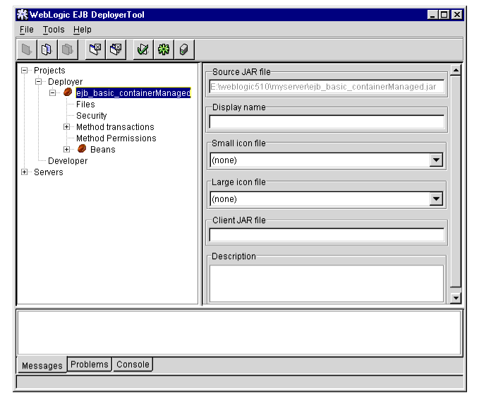 The WebLogic Server DeployerTool provides a graphical interface that Application Assemblers can use to deploy EJBs to one or more WebLogic Servers. DeployerTool simplifies the process of configuring EJB deployment properties and mapping EJB references to actual resource factories, roles and other EJBs available on a server.