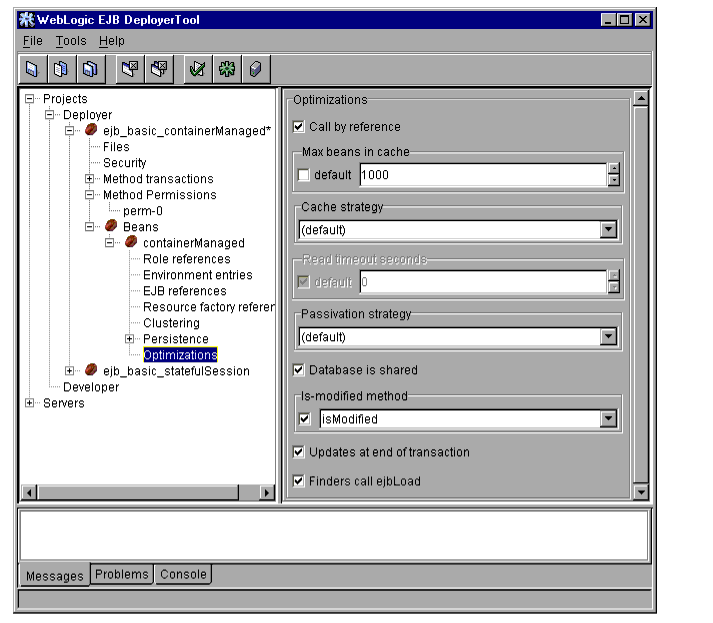 When you modify deployment properties with DeployerTool, the utility updates and saves information in the XML deployment files, ensuring that the XML is correct for its associated DTD. DeployerTool can modify certain properties in ejb-jar.xml. It can also create the weblogic-ejb-jar.xml and weblogic-cmp-rdbms-jar.xml files if they are not available in the .jar.