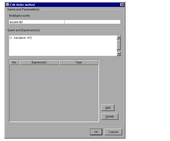 The Query and Expression(s) section lists the text of the WLQL query for the finder method. The WLQL query uses number designations ($0 in the example above) to represent values supplied by the finder method arguments, or values supplied by embedded Java expressions.