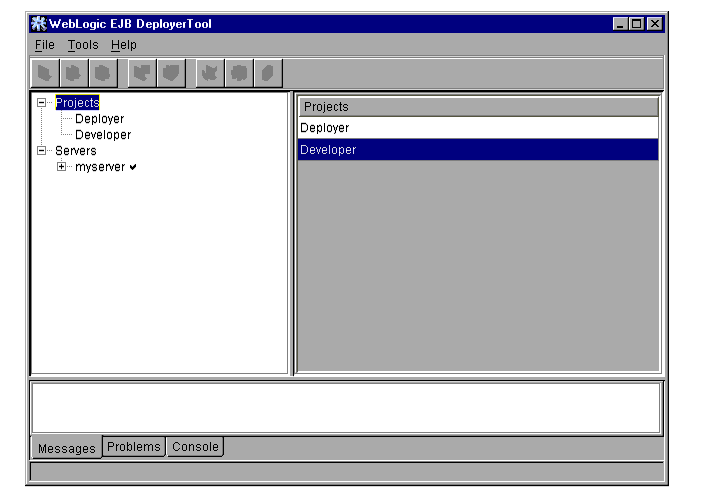 To satisfy the requirements of these roles, DeployerTool provides complete controls for managing multiple EJB .jar files and WebLogic Servers, and for configuring WebLogic Server deployment properties and resources. Roles are designated by two primary types of DeployerTool projects: deployer projects and developer projects.