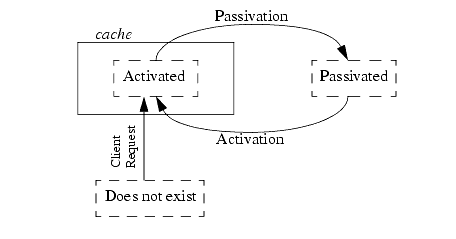 The following figure illustrates the WebLogic Server cache, and the processes by which stateful EJBs enter and leave the cache. Dotted lines indicate the state of the EJB from the perspective of WebLogic Server.