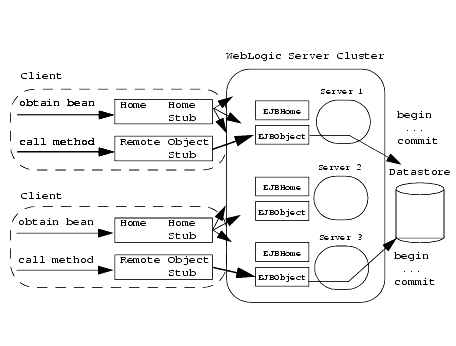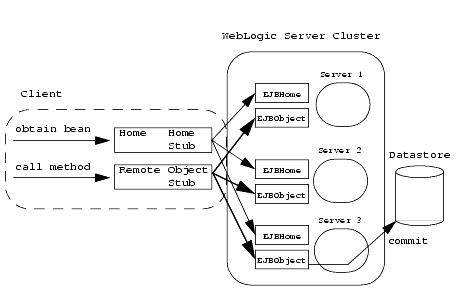 EJBs in a WebLogic Server cluster operate using modified versions of two key structures: the Home object and the EJB Object. In a single server (unclustered) environment, a client looks up an EJB via the EJB's home interface, which is backed on the server by a corresponding home object. After referencing the bean, the client interacts with the bean's methods via the remote interface, which is backed on the server by an EJB object.
