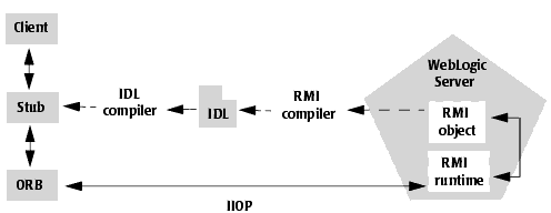 The client obtains a reference to the remote object and forwards method calls through the stub. WebLogic Server implements a CosNaming service that parses incoming IIOP requests and dispatches them directly into the RMI runtime.